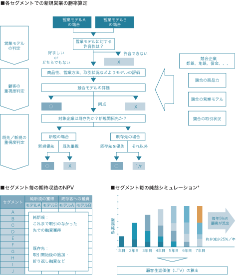 - 潜在市場サイズ、顧客の生涯価値、競合時の勝率、打ち手による収益の差異、将来収益の予測とNPV(現在価値)など、あらゆる観点からマーケティング情報を「収益という数字」に換算し、経営判断に耐えうる戦略オプションを策定