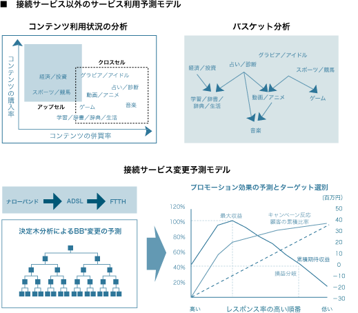 また、ブロードバンドへのアップセルができる可能性が高いポテンシャルユーザーを決定木分析によって分類・特定し、ターゲット毎にプロモーションの費用対効果を検証することで、無駄なコストを削減し効率的な活動を実現した。
